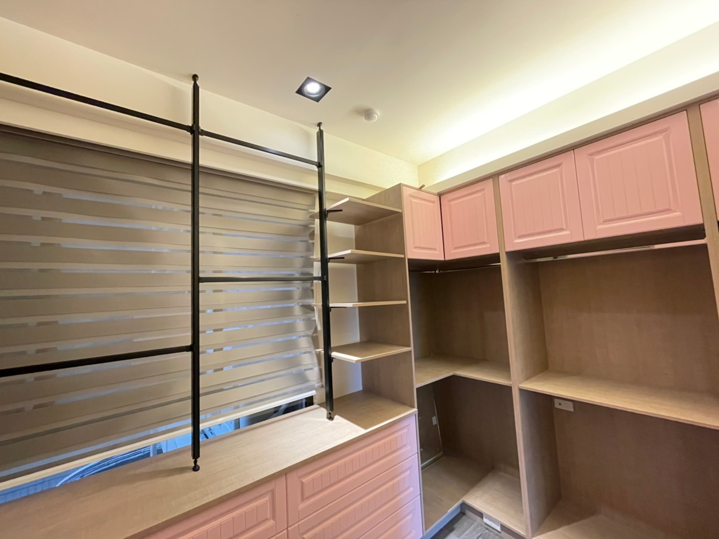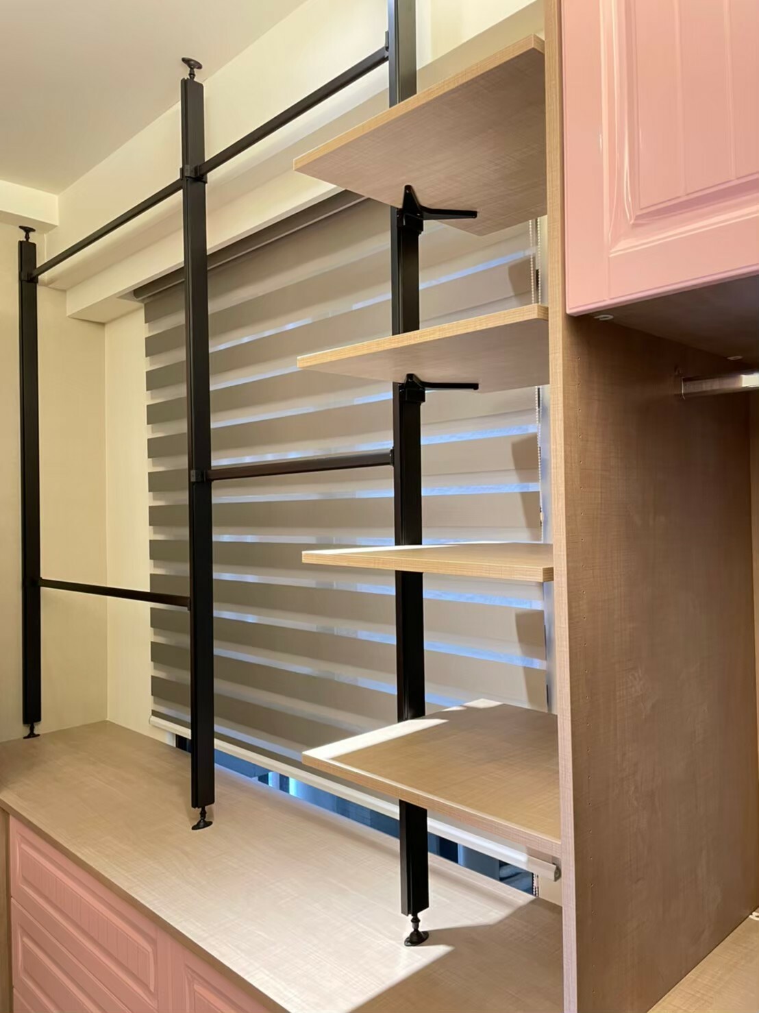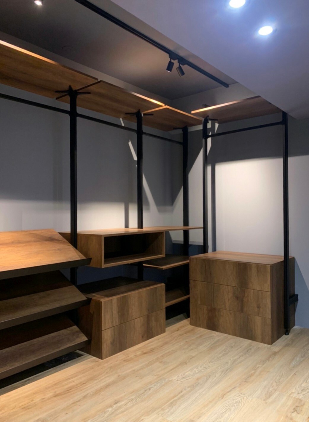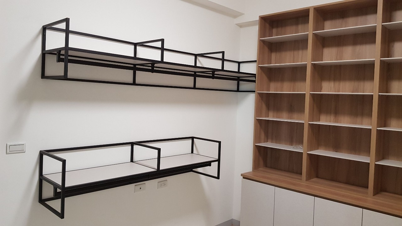 從基本的層板、吊衣桿,提升到與木作或系統櫃的結合,讓設計不在單調,開放俐落的線條搭配客製化抽屜櫃 給予空間更多樣化的收納