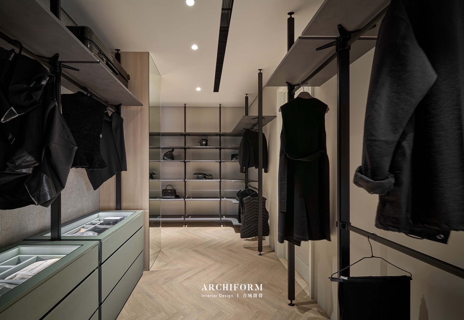 此系統可靈活應用於 更衣間、開放式衣櫥 與 層板收納,以簡約線條打造俐落空間,提升居家質感與機能。