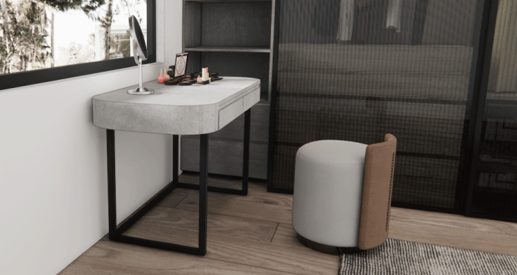 鋁框結合弧形桌面,線條細緻圓潤;雙抽屜設計可收納化妝小物;高度依身高比例客製,專屬自己的梳妝空間