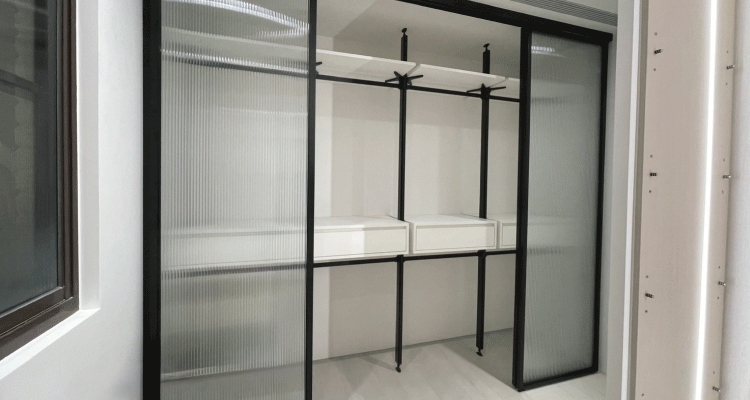 鋁框滑門左右橫拉節省空間;搭配長虹玻璃,光線穿透卻保有隱私,兼具美觀實用,是現代衣櫥滑門首選。