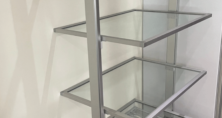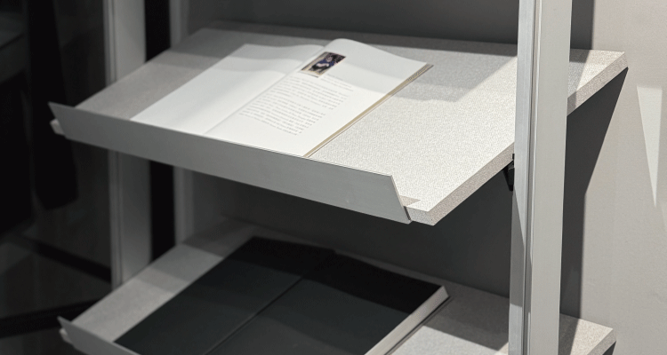 斜角層板有兩種角度,適合書籍與鞋履擺放,鋁檔片搭配木層板提升展示的美感。